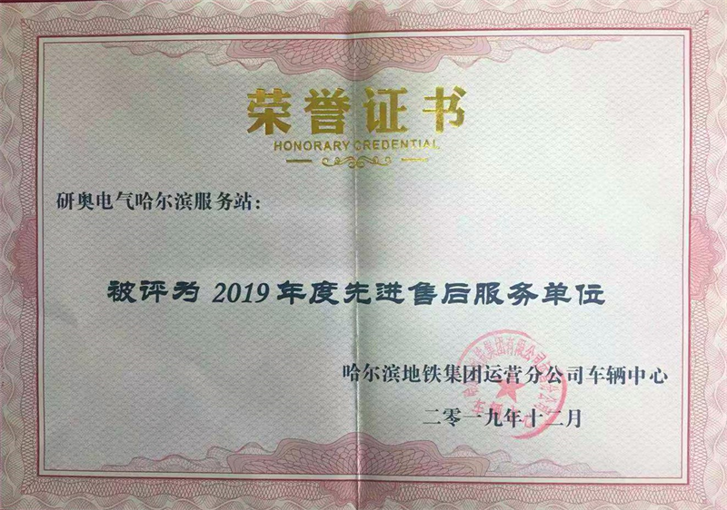 2019年12月凤凰联盟哈尔滨服务站被哈尔滨地铁集团运营分公司车辆中心评为“2019年度先进售后服务单位”荣誉称号。